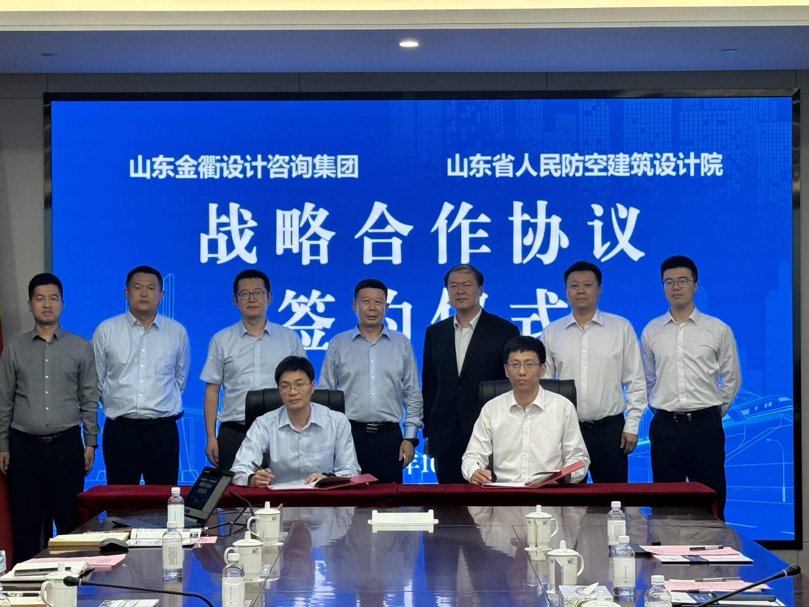 近日,山东金衢设计咨询集团与山东省人民防空建筑设计院(中铁十四局集团设计咨询研究院)举行战略合作签约仪式。中铁十四局集团山东区域总部副总经理黄强、省人防设计院总经理毛伟刚,金衢设计咨询集团总经理姜成岭出席签约仪式。